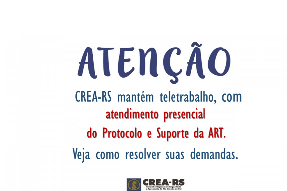 CREA-RS mantém teletrabalho, com atendimento presencial do Protocolo e Suporte da ART   Novos pedidos de registro de atestado de capacidade técnica a partir de 1 de junho