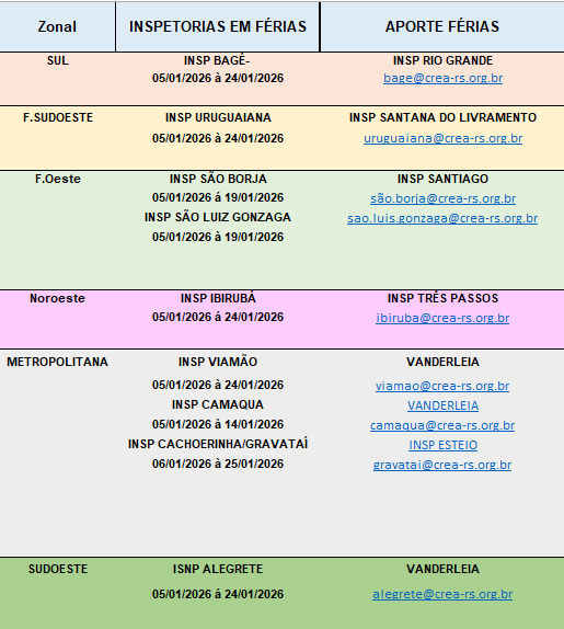 Em virtude do período de férias funcionais, informamos a relação das Inspetorias que estarão fechadas para atendimento ou com horário diferenciado. Orientamos o profissional que poderá, em havendo necessidade de atendimento presencial, buscar a Inspetoria mais próxima de sua região, observando os horários e dias de atendimento condicionados às bandeiras locais de risco, ou acessar nossos diversos canais digitais de atendimento.