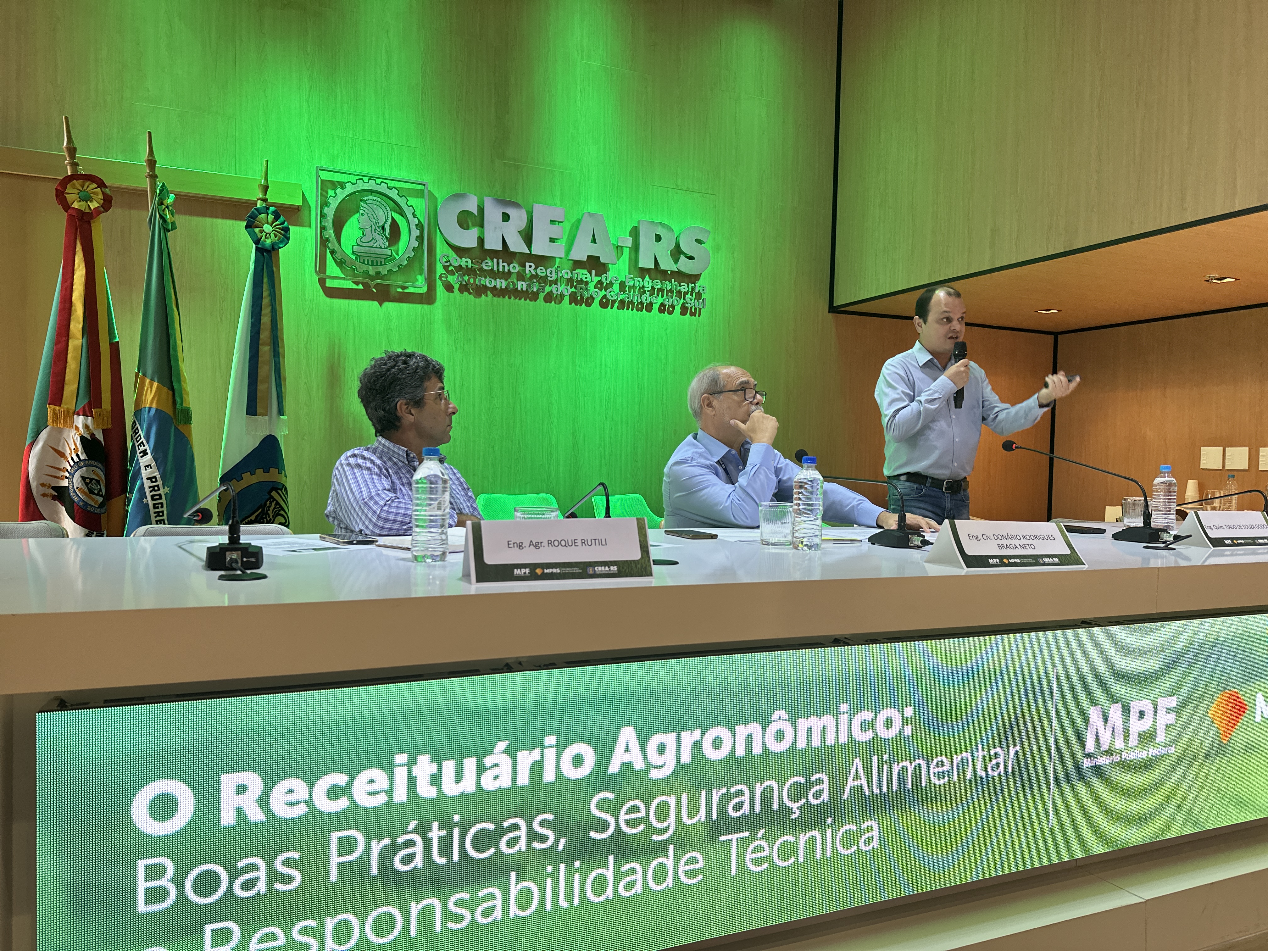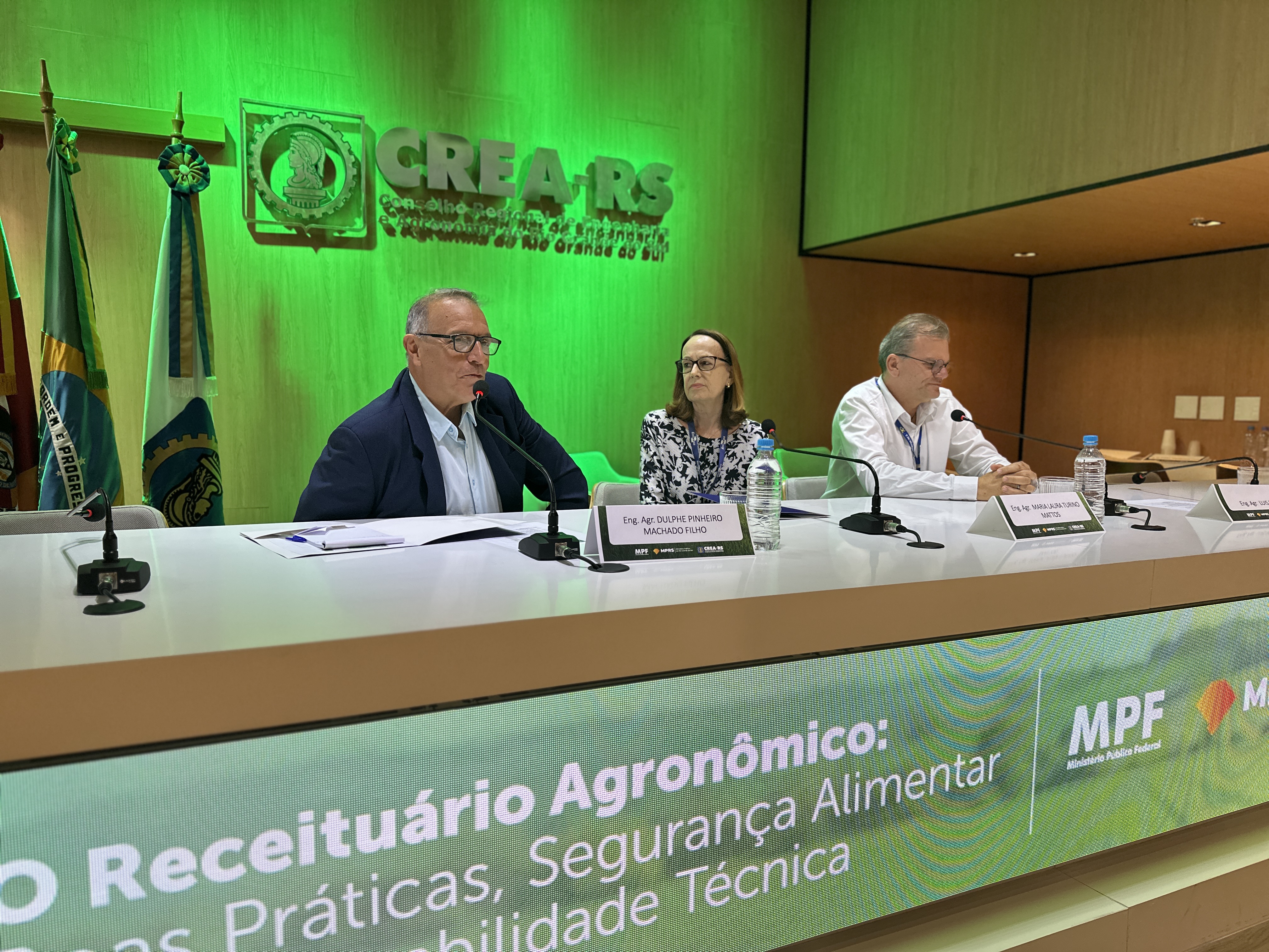 A mesa de abertura contou com a presidente do CREA-RS, Eng. Amb. Nanci Walter; o conselheiro federal pelo RS, Eng. Eletricista José Cláudio Sicco; a procuradora da República no RS do MPF, Dra. Ana Paula Carvalho de Medeiros; a coordenadora do Centro de Apoio Operacional de Defesa do Meio Ambiente do MP-RS, Dra. Ana Maria Marchesan; o diretor de defesa vegetal da SEAPI, Eng. Agr. Ricardo Felicetti; o 1o vice-presidente do CREA-RS, Eng. Agr. Roque Rutili; e o coordenador da Câmara de Agronomia, Eng. Agr. Juarez Morbini Lopes.