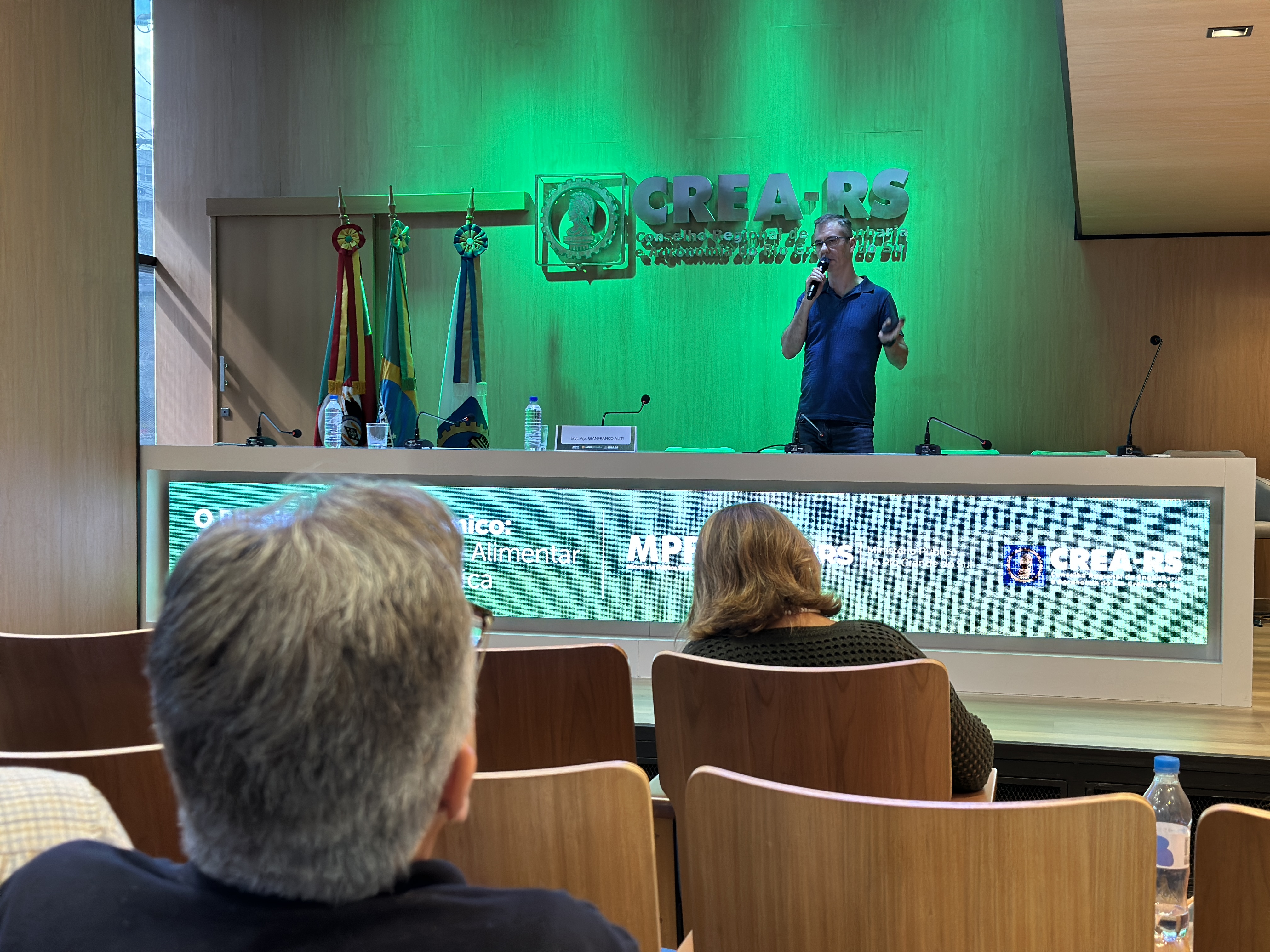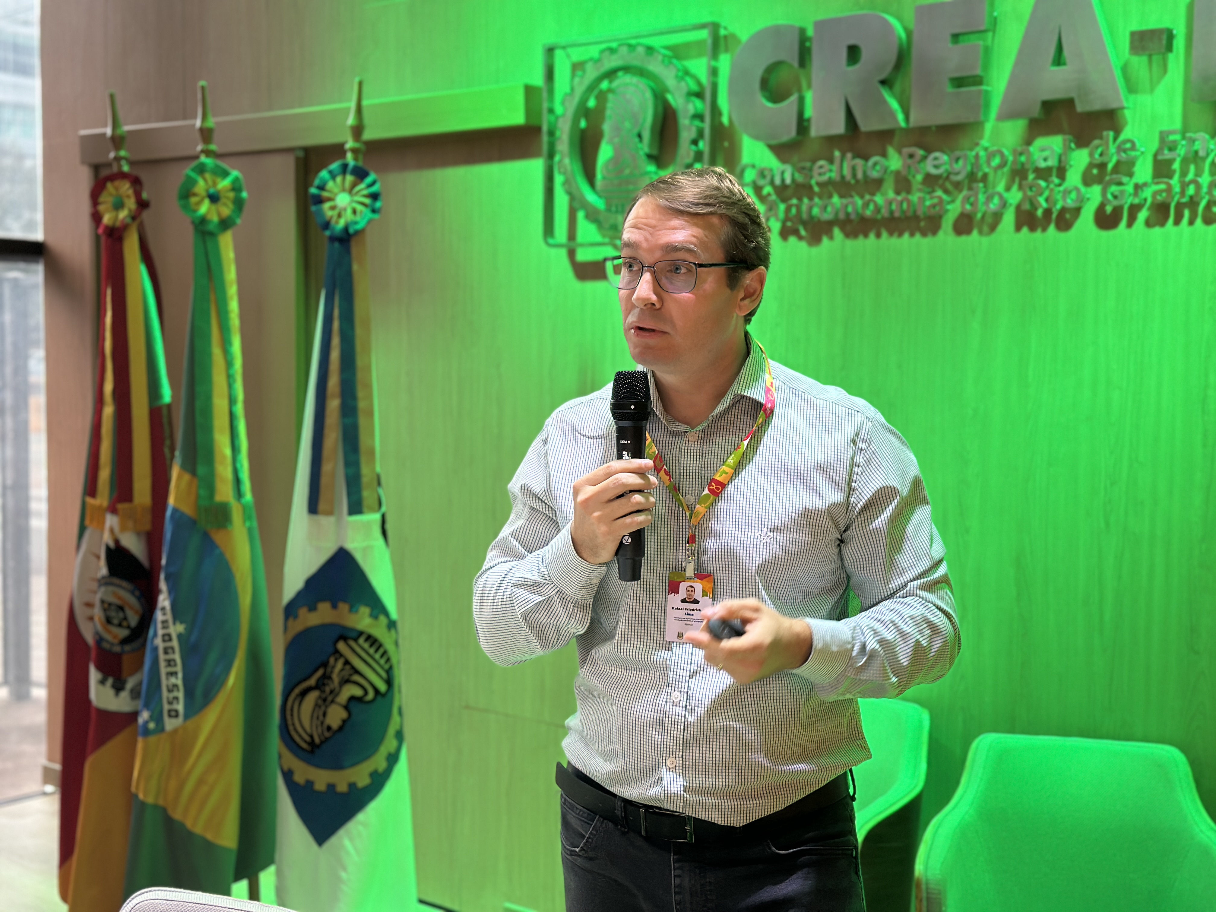 Pela SEAPI, o Eng. Agr. Ricardo Felicetti parabenizou o CREA-RS pela iniciativa e ressaltou o desafio da responsabilidade técnica diante da necessidade de produzir alimentos com segurança econômica e sanitária. Enfatizou a responsabilidade de encaminhar tecnologia de forma responsável e o apoio institucional para práticas seguras.