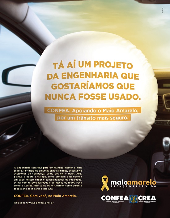 Com destaque para um airbag inflado, a campanha, realizada pelo Confea, chama atenção dos motoristas dizendo: “Tá aí um projeto da Engenharia que gostaríamos que nunca fosse usado”. O mote leva à reflexão de que a Engenharia contribui para um trânsito melhor, seja quando profissionais desenvolvem acessórios de segurança, como freios ABS, ou quando planejam e operam o tráfego. Mas de nada adianta uma tecnologia preventiva, se todos os envolvidos no trânsito não estiverem comprometidos com a precaução. “Dirigir com responsabilidade é obrigação de todos. Faça como o Confea. Não só no Maio Amarelo, como durante todo o ano, faça parte dessa luta”, conclui o anúncio.